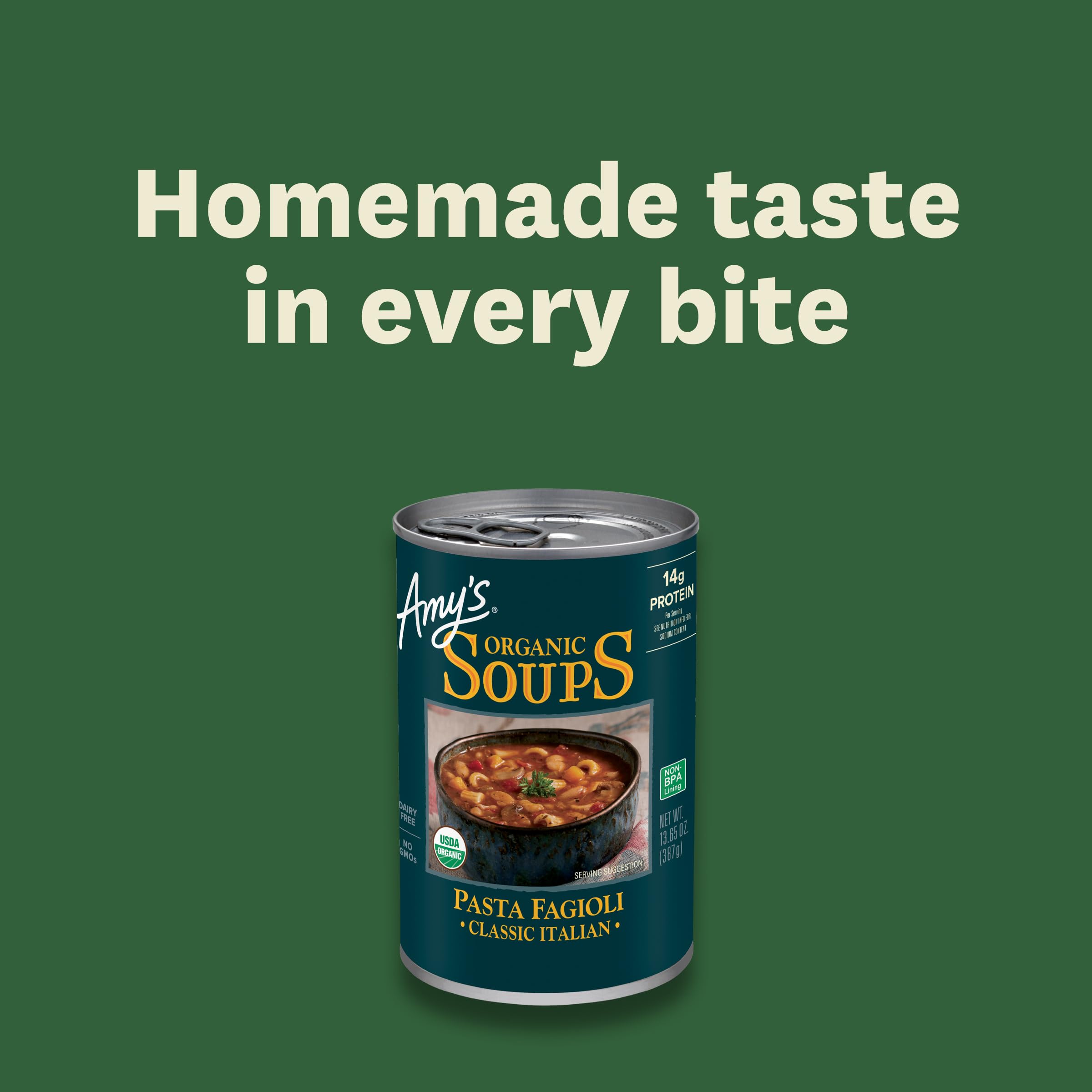 Since 1987. Amys Kitchen produces delicious. convenient quick meals and vegetarian food for people who are sometimes too busy to cook Amy’s Organic Pasta Fagioli is made from organic pasta. creamy organic cannellini beans and garden vegetables simmered in an herbaceous broth This plant based microwave soup is vegetarian and vegan-friendly and certified organic. a great option for dietary restrictions or preferences