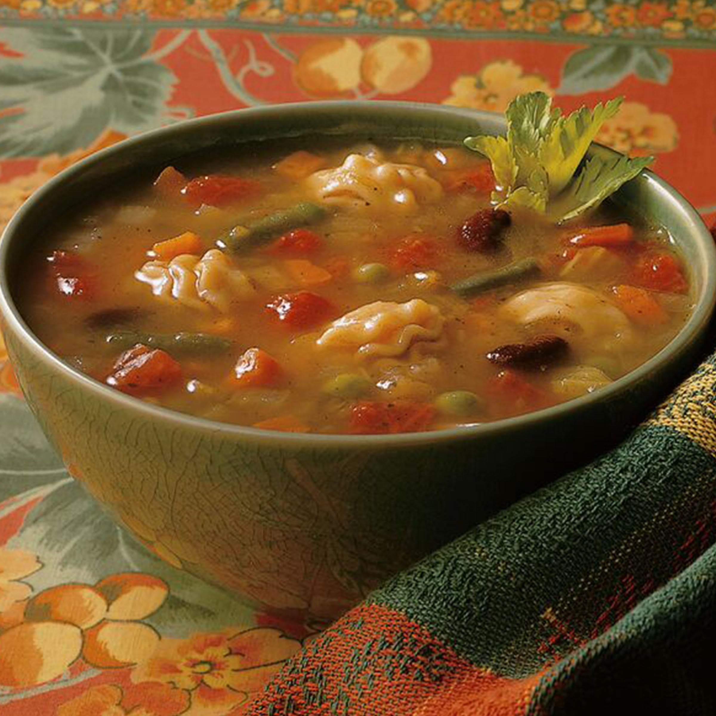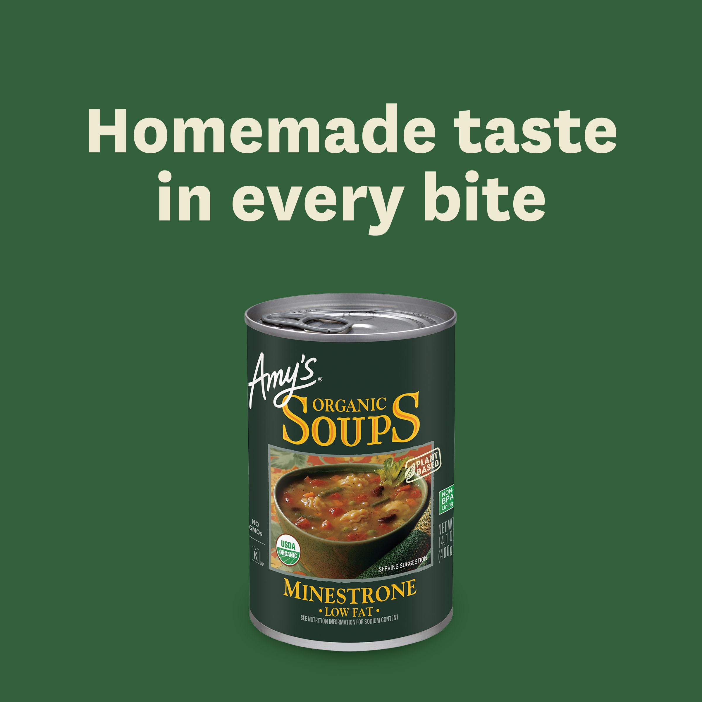 One 14.1-oz can of Amys Organic Minestrone Soup Minestrone soup made from scratch with all organic vegetables. including onions. carrots. potatoes. celery. green beans. peas. tender beans and pasta in a savory tomato broth for a delicious easy dinner or quick vegan meals without compromise This canned soup contains 6g of plant based protein and 6g of fiber per serving; Amy’s Italian vegetable soup is Non-GMO. USDA-Certified Organic. Dairy Free. Vegan and Certified Kosher for a high-quality plant based food everyone can enjoy